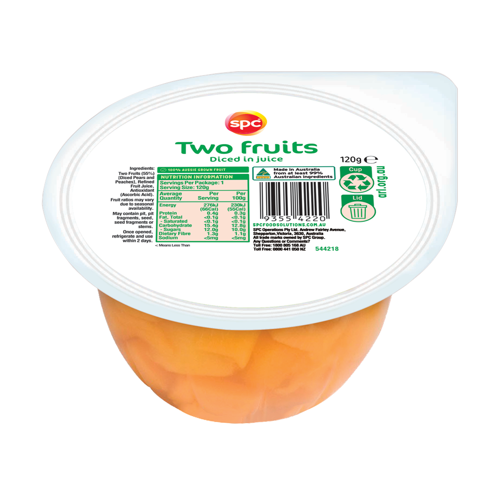 Australian Grown Diced Two Fruits (55% Min) [Diced Pears & Peaches], Refined Fruit Juice, Antioxidant (Ascorbic Acid), Food Acid (Citric), Firming Agent (Calcium Chloride)